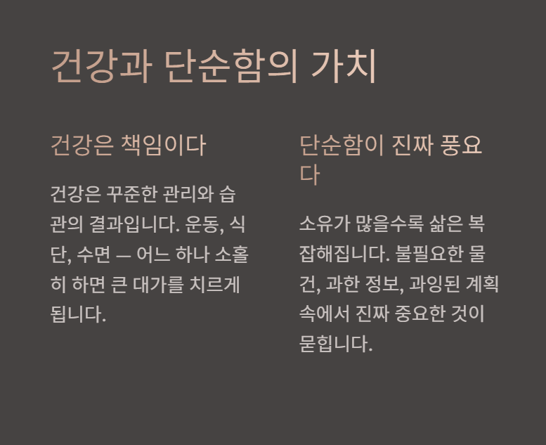 건강은 누구에게나 주어지는 기본 조건 같지만, 사실은 꾸준한 관리와 습관의 결과입니다. 운동, 식단, 수면 — 어느 하나 소홀히 하면 큰 대가를 치르게 됩니다. 몸이 아프면 마음도 병드는 법. 나를 사랑하는 방식 중 하나는 ‘내 몸을 돌보는 것’입니다.
