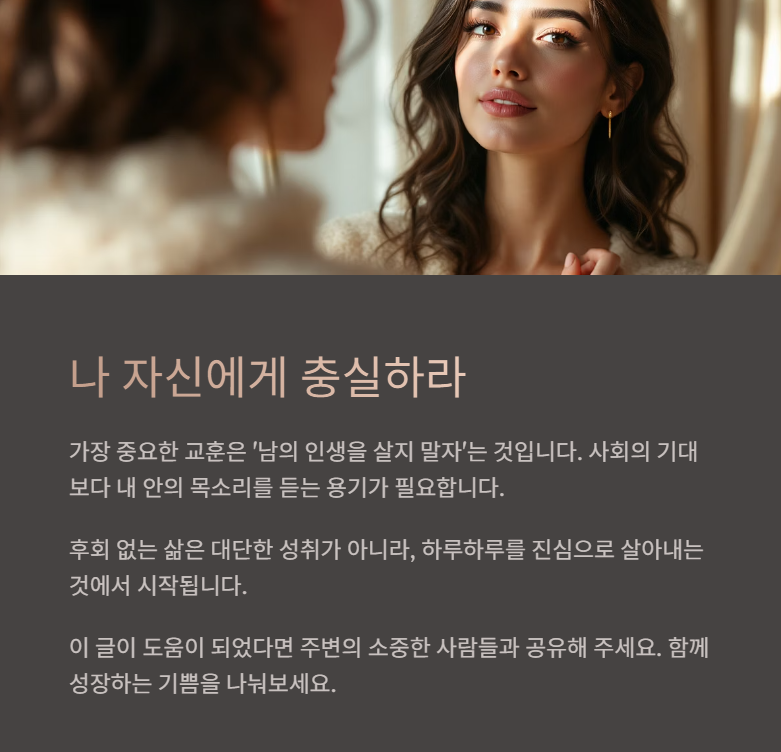 가장 중요한 교훈 중 하나는, '남의 인생을 살지 말자'는 것입니다. 사회의 기대, 타인의 시선에 맞추기보다는 내 안의 목소리를 듣는 용기가 필요합니다. 진정한 자유는 타인의 눈이 아니라 내 마음에서 비롯됩니다.