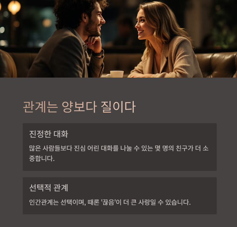 많은 사람들과 어울리는 것보다, 진정한 대화를 나눌 수 있는 몇 명의 친구가 더 소중합니다. 나이가 들수록 불필요한 인간관계에 소모되는 에너지가 줄고, 진심 어린 관계의 가치가 더 빛을 발하죠. 인간관계는 선택이며, 때론 '끊음'이 더 큰 사랑일 수 있습니다.