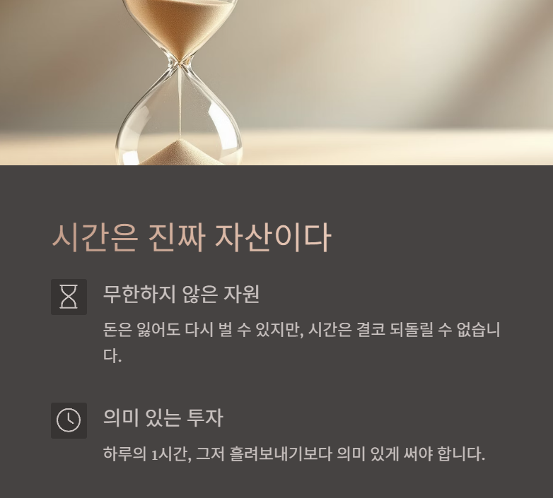 젊을 땐 시간이 무한한 줄 알았습니다. 하지만 나이가 들수록, 하루하루가 얼마나 소중한지 절실히 깨닫게 됩니다. 돈은 잃어도 다시 벌 수 있지만, 시간은 결코 되돌릴 수 없습니다. 한 철학자는 “시간은 존재의 본질을 드러내는 거울”이라 했지요. 하루의 1시간, 그저 흘려보내기보다 의미 있게 써야 하는 이유입니다.