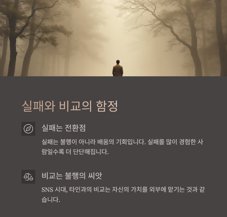 SNS가 발달한 시대, 우리는 끊임없이 타인의 삶과 비교합니다. 그러나 비교는 자신의 가치를 외부에 맡기는 것과 같습니다. 철학자 스피노자는 “외적 요인에 의존한 기쁨은 쉽게 사라진다”고 말했습니다. 나만의 속도로 걷는 삶이 결국 가장 멀리 갑니다.