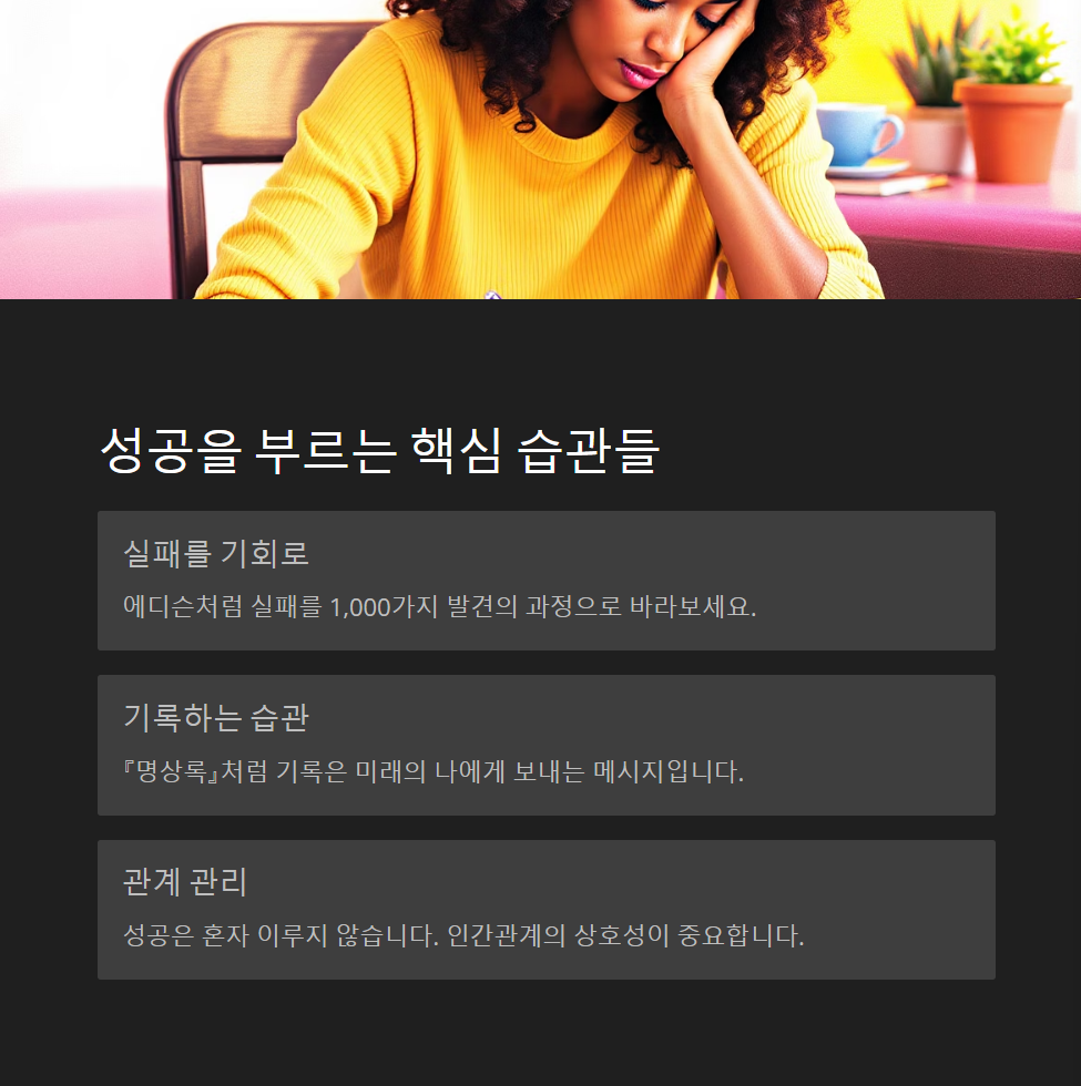 성공한 이들의 내면에는 독특한 사고방식이 존재한다. 그들은 실패를 실패로 보지 않는다. 오히려 실패를 통해 자신을 재구성하고, 성장의 밑거름으로 삼는다. 토마스 에디슨은 전구를 발명하기까지 1,000번이 넘는 실패를 겪었지만, 그는 이를 “전구가 작동하지 않는 방법을 1,000가지 알아낸 것”이라 표현했다. 실패에 굴복하지 않고 그것을 재료로 삼는 자세, 그 자체가 성공을 부르는 습관이다.