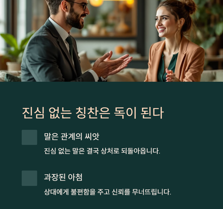 “말은 씨가 된다”는 속담처럼, 말은 관계의 씨앗이 됩니다. 하지만 그 말이 진심이 아니라면, 결국 상처로 되돌아옵니다. 특히 지나치게 과장된 칭찬이나 뭔가를 얻기 위한 아첨은 상대에게 불편함을 주고, 신뢰를 무너뜨립니다. 철학자 칸트는 “사람은 수단이 아니라 목적이어야 한다”고 말했죠. 진심 없는 칭찬은 타인을 수단으로 삼는 행위입니다.