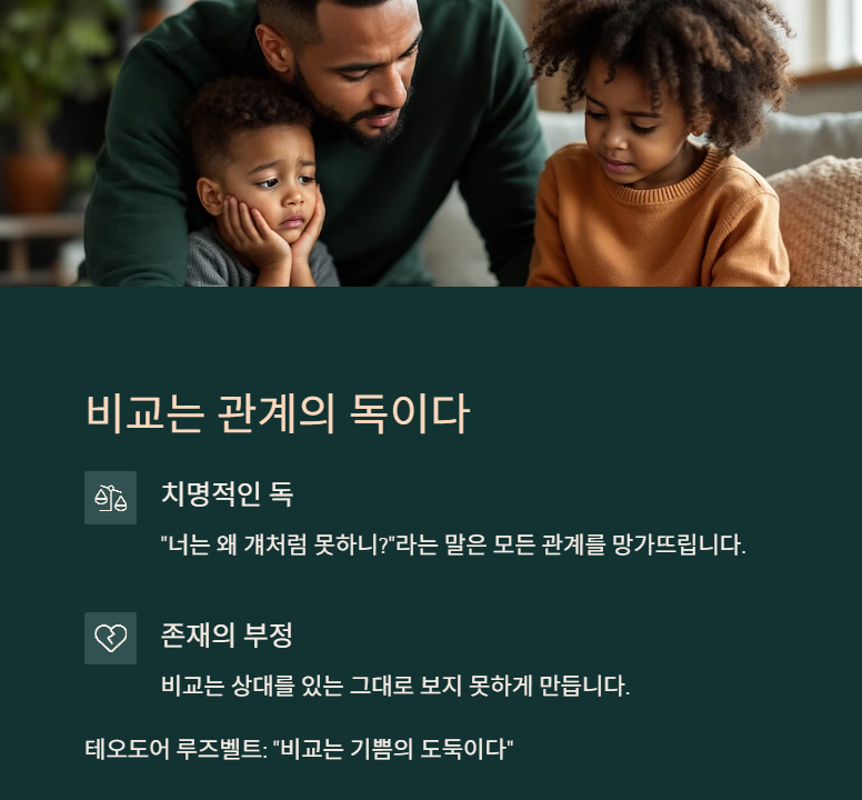 “너는 왜 걔처럼 못하니?”라는 말은 가족 관계든, 친구 사이든, 모든 관계를 망가뜨릴 수 있는 치명적인 독입니다. 비교는 상대를 있는 그대로 보지 못하게 만들고, 존재 자체를 부정하게 됩니다. 타인을 비교하는 순간, 진정한 만남은 사라집니다.