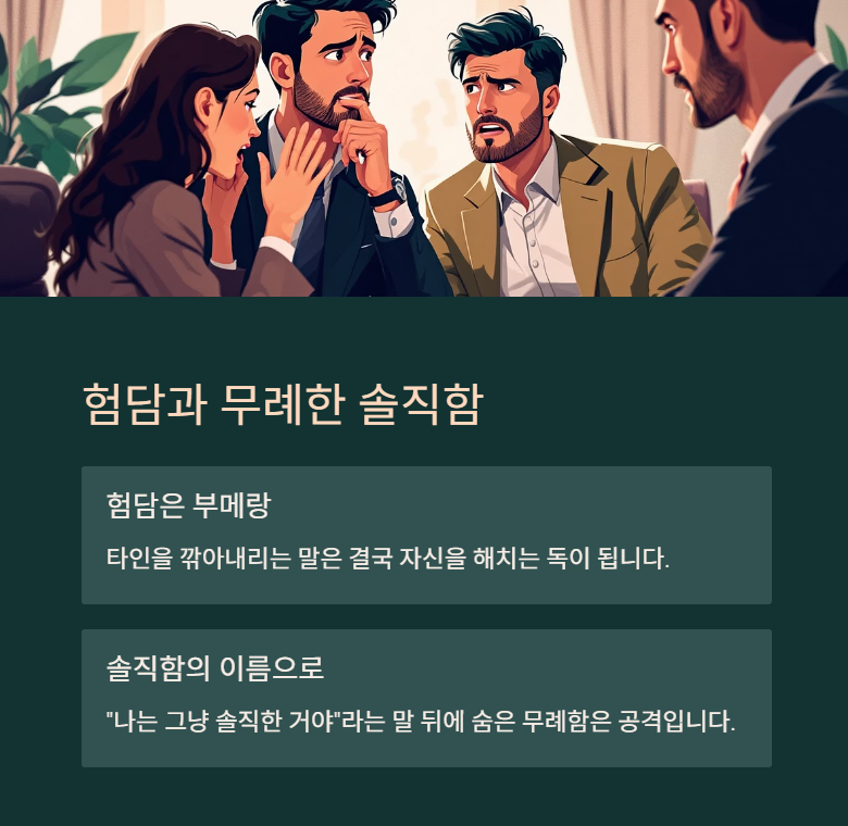 타인을 깎아내리는 말은 일시적인 친밀감을 줄 수 있지만, 결국 자신을 드러내는 부메랑이 됩니다. 뒷말을 하는 사람은 결국 앞에서도 신뢰를 얻지 못하죠. 인간관계에서 신뢰는 가장 중요한 자산이며, 험담은 그것을 갉아먹는 독입니다.