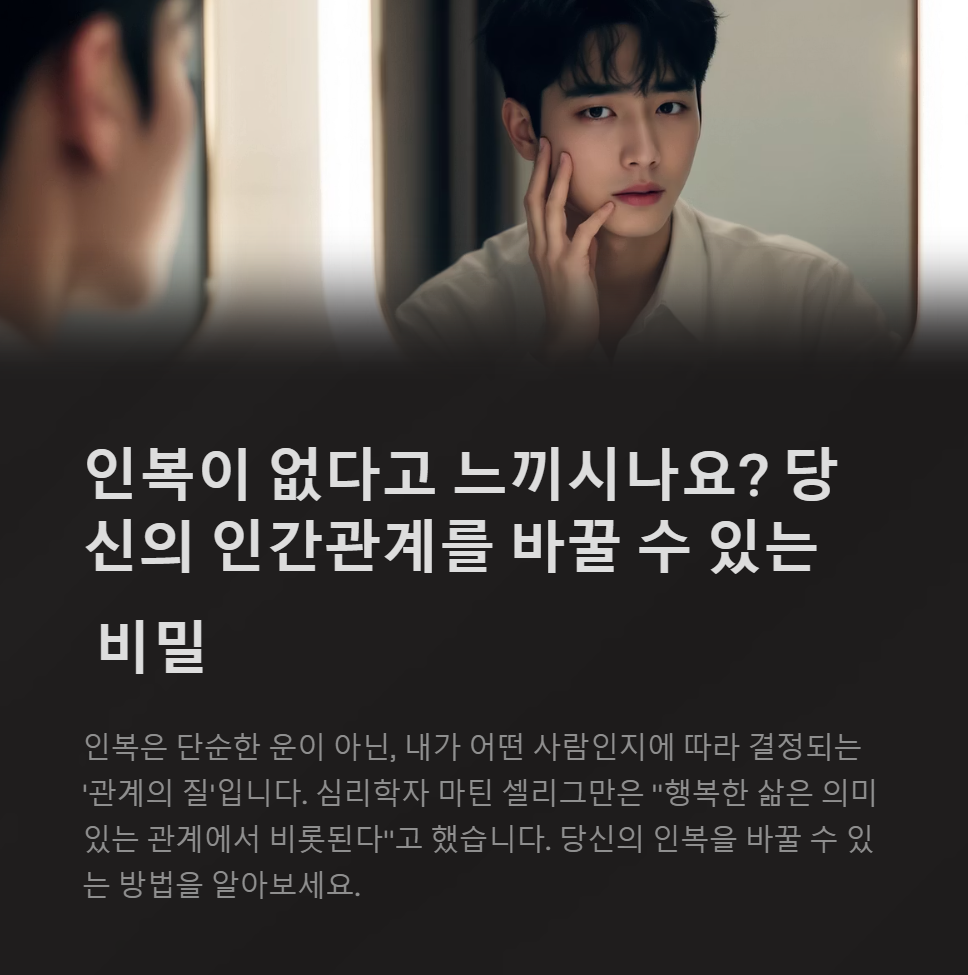심리학자 마틴 셀리그만은 긍정심리학에서 "행복한 삶은 의미 있는 관계에서 비롯된다"고 했습니다. 즉, 인복은 단순한 운이 아니라 삶의 한 축을 이루는 능력입니다. 그렇기에 인복이 없다고 느낀다면, 그 자체가 인생의 큰 고민이 될 수 있죠.