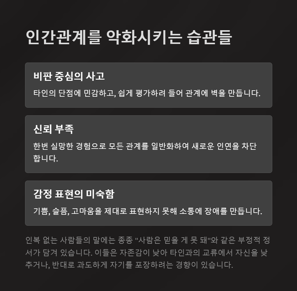 인복 없는 사람들의 말에는 종종 부정적인 정서가 담겨 있습니다. 예컨대 "사람은 믿을 게 못 돼" 같은 말은 듣는 이에게 벽을 세우게 하죠. 또한, 부탁을 어려워하고, 감사의 표현에 인색한 경우가 많습니다.