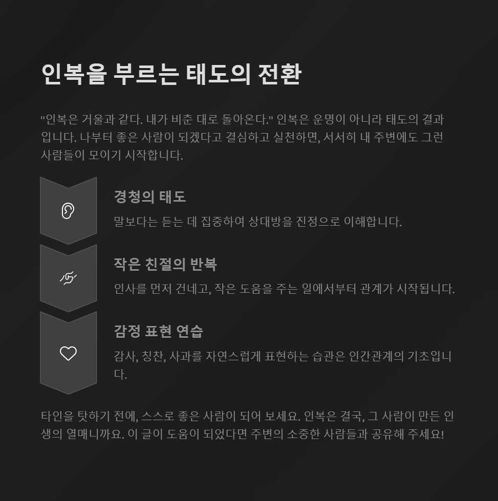 그동안 인복이 없다고 느꼈다면, 그것은 어쩌면 '나'를 돌아보라는 인생의 신호였는지도 모릅니다. 나의 언어, 태도, 사고방식을 조금만 바꾸면, 세상은 조금 더 따뜻해질 수 있습니다.