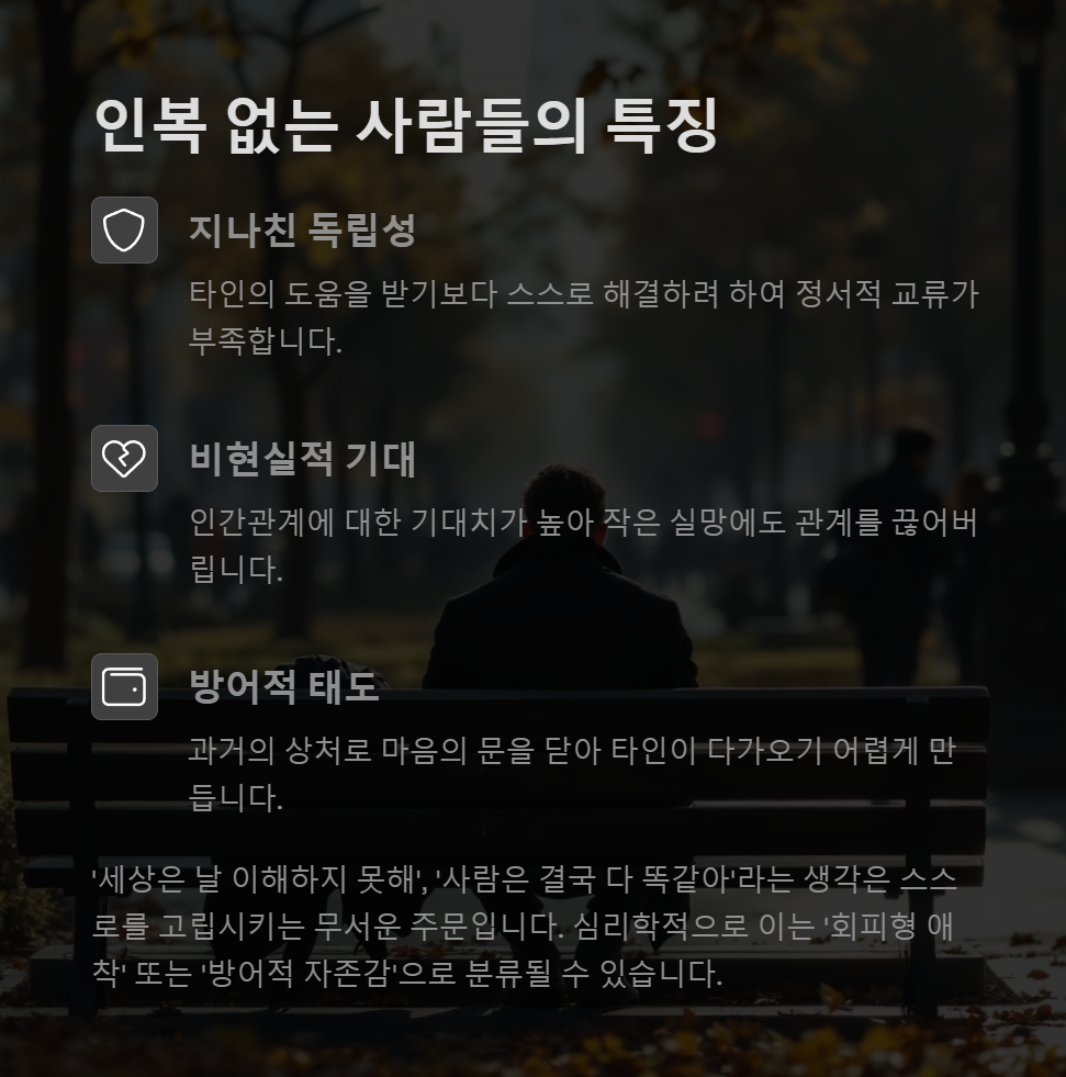 인복이 없다고 느끼는 사람들에겐 몇 가지 공통적인 특징이 있습니다. 첫째, 지나치게 독립적인 성향입니다. 타인의 도움을 받기보다 스스로 해결하려 하기에 타인과의 정서적 교류가 적습니다. 둘째, 인간관계에 대한 기대치가 비현실적으로 높습니다. 누군가가 조금만 기대에 못 미치면 금세 실망하고 관계를 끊어버리는 경향이 있죠.