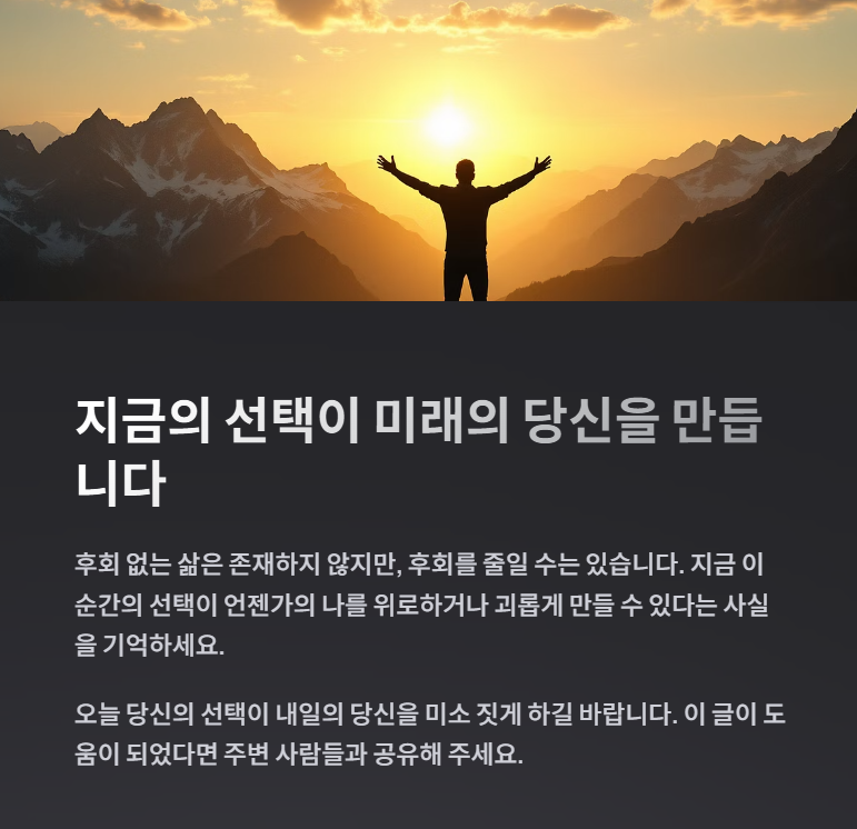 후회 없는 삶은 존재하지 않는다. 그러나 후회를 줄일 수는 있다. 지금 이 순간의 선택이 언젠가의 나를 위로하거나, 괴롭게 만들 수 있다는 사실을 기억하자. 삶은 되돌릴 수 없지만, 매 순간의 선택은 지금 이 자리에서 다시 시작할 수 있다. 그러니, 오늘 당신의 선택이 내일의 당신을 미소 짓게 하길 바란다.