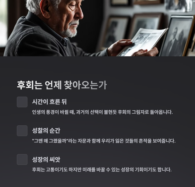 우리는 대개 지금의 선택을 '옳은 결정'이라 믿는다. 그 판단은 그 당시의 경험, 감정, 환경에 기반한 것이다. 그러나 시간이 흐르고, 인생의 풍경이 바뀔 때, 과거의 그 선택이 불현듯 후회의 그림자로 돌아오곤 한다. 후회란, '그땐 왜 그랬을까'라는 자문과 함께 찾아오며, 우리가 잃은 것들의 흔적을 또렷이 보여준다. 철학자 마르쿠스 아우렐리우스는 "과거는 바꿀 수 없지만, 그것을 성찰함으로써 미래를 바꿀 수 있다"고 했다. 후회는 고통이기도 하지만 성장의 씨앗이기도 하다.