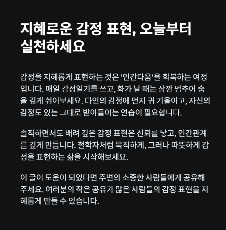 지혜로운 감정 표현은 결국 ‘인간다움’을 회복하는 여정입니다. 너무 자주 우리는 감정을 억누르거나 과잉 표출하며 상처를 주고받습니다. 하지만 진정한 감정 표현은 평온 속에서도 진심이 전해지는 방식으로 존재합니다. 철학자처럼 묵직하게, 그러나 따뜻하게 감정을 표현하는 삶. 그것이 내가 지난 세월 동안 배운 ‘지혜의 언어’입니다.